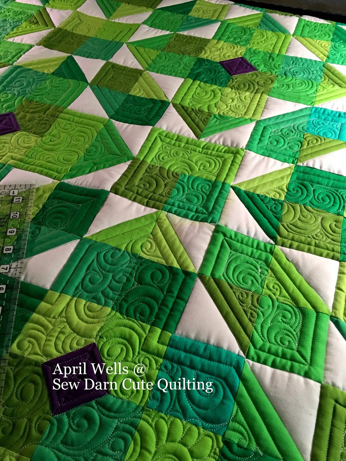 But Wait I had one more Greenery Challenge come through my door. Elizabeth Ray asked me to help her finish out quilting her Greenery Challenge. The Green half was quilted by Elizabeth and the White half was quilted by me.